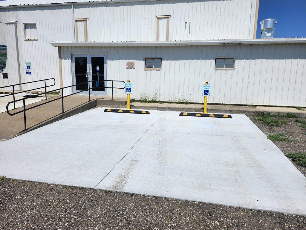 Final work on recent concrete improvements were completed in August Handicap signage was added to the concrete parking spots, and a concrete ramp was also poured to connect the storage trailer to the rear entrance of the facility. A concrete pad for the Vesper community dumpster was also poured. These improvements were made possible with the Post Rock Community Foundation grant, individual donations and free labor which was provided by Danny Huehl, Kansas Homes and Movers and other Vesper community center volunteers.